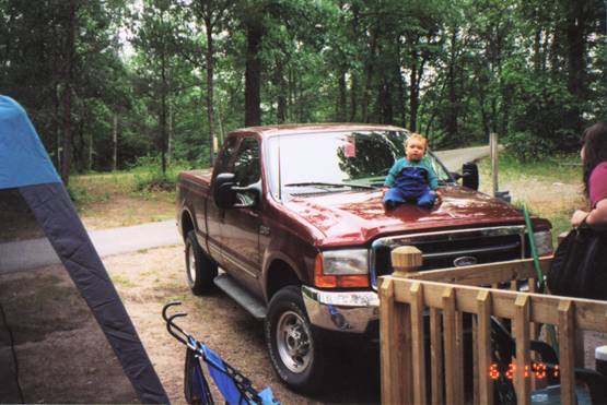 Saturday: Mary's mom watched Dean for us so that we could pack. About noon, we started to depart, as I was turning out of the drive I head a crunch, I had turned the camper into Thunderbird. Luckily there was only some mine scrapes to the car, and a repairable whole in the camper. What is ironic is that my neighbor only parks in front of their house a few times a year, and this was one of them. The trip down was uneventful after that, we arrived at the park at around 5:30. I unpacked while Mary took Dean down for his first swim in a lake, he LOVED it. It was the coolest thing for him